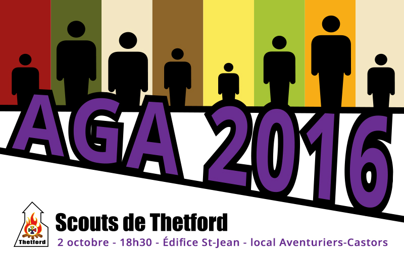 Les Scouts de Thetford invitent tous les membres adultes ainsi que tous les parents des membres jeunes à leur assemblée générale annuelle 2016. L’AGA est une bonne façon pour les parents de se tenir informé des activités générales de tout le mouvement scout à Thetford.